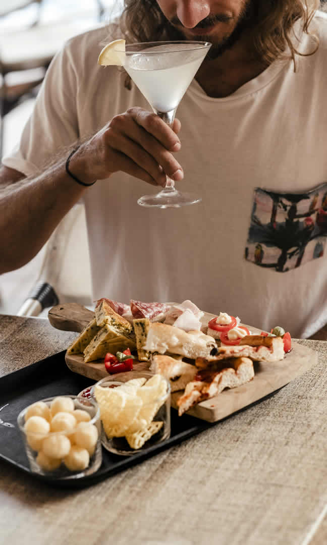 Al calar del sole il bar diventa il fulcro del Villaggio: concediti una birra, un bicchiere di vino o uno spritz a bordo piscina ascoltando un po’ di buona musica, accompagnato da un aperitivo con prodotti locali dell’Azienda Agricola Cà di GiuEle.